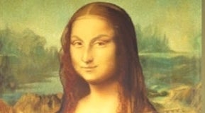 I have a Mona Lisa on my fridge. Not the Mona Lisa, just Mona Lisa. This one is free from the smokey yellow varnish of the one in the Louvre, and so its colours shine. The sky behind the sitter is very blue, her face is very pale, and her sleeves are a sort of bright terracotta.